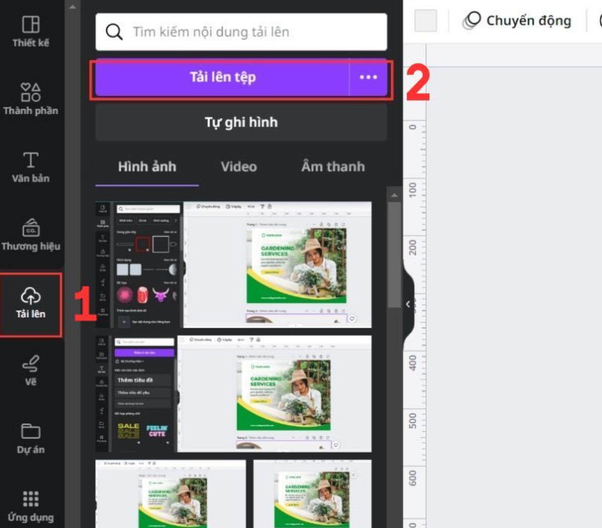 Tiếp theo là Tải lên: hình ảnh, logo, video, file âm thanh. Điều này đặc biệt hữu ích khi bạn cần sử dụng hình ảnh tự chụp hoặc sử dụng nhận diện thương hiệu của công ty.