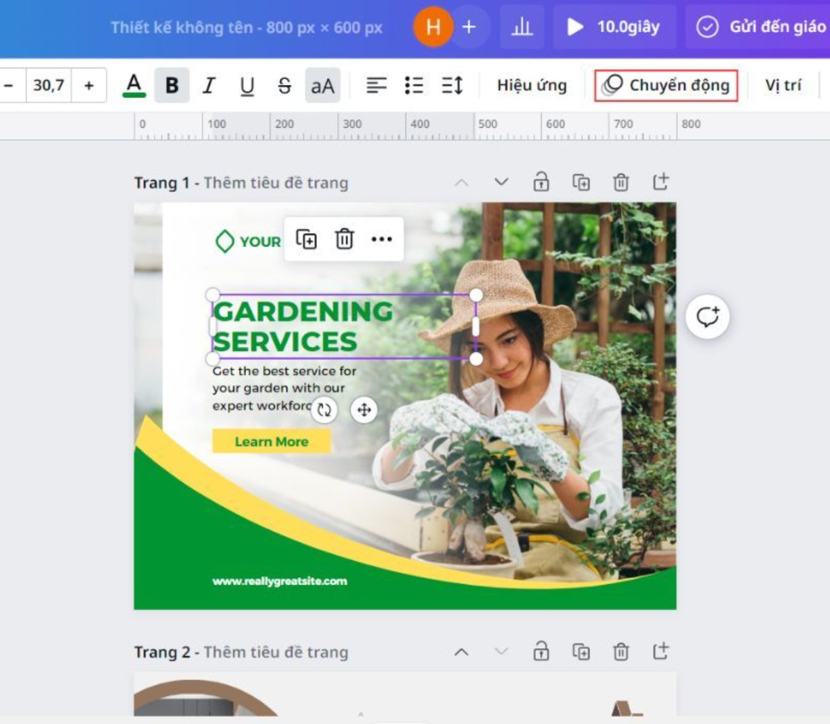 Để thêm hiệu ứng cho đối tượng, bạn chọn đối tượng đó, sau đó nhấn vào mục Chuyển động. Canva cung cấp nhiều dạng hiệu ứng như fade, rise, bounce, pan, zoom hay slide. Mỗi hiệu ứng đều cho phép bạn điều chỉnh tốc độ, hướng, độ mạnh yếu. Điều này giúp bạn kiểm soát mức độ tinh tế hoặc nổi bật của chuyển động.