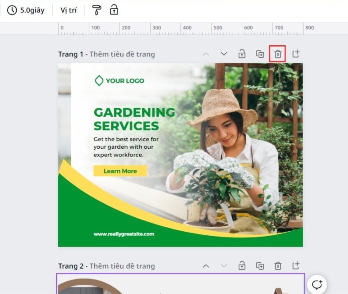 Trong trường hợp bạn muốn xóa một slide, bạn chọn biểu tượng Xóa trang. Canva cũng cho phép bạn kéo thả để thay đổi vị trí các slide, giúp bạn dễ dàng sắp xếp lại bố cục bài thuyết trình theo trình tự hợp lý.