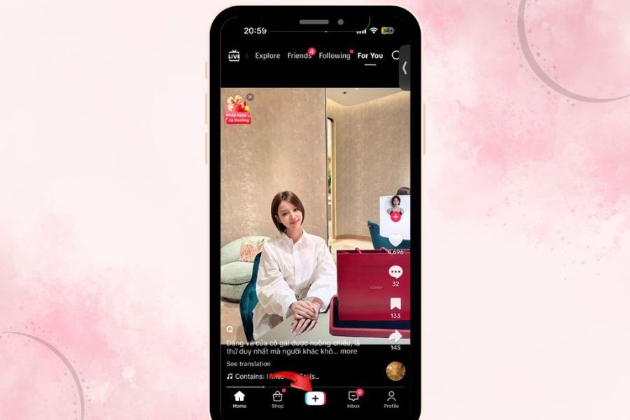 Sau khi vào trang chủ TikTok, hãy nhấn vào biểu tượng dấu “+” nằm ở chính giữa thanh công cụ phía dưới màn hình. Đây là khu vực cho phép người dùng quay video, chụp ảnh hoặc tạo nội dung mới. Khi giao diện quay video mở ra, bạn sẽ thấy các tùy chọn như hiệu ứng, bộ lọc và thư viện ảnh để chuẩn bị cho bước tạo bó hoa bằng ảnh cá nhân.