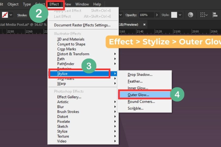 Trên thanh menu, vào Effect, sau đó chọn Stylize, và cuối cùng chọn Outer Glow để mở hộp thoại cài đặt hiệu ứng. Đây là nơi bạn sẽ tinh chỉnh ánh sáng, độ mờ và màu sắc phù hợp với thiết kế của mình. Outer Glow là công cụ mạnh mẽ giúp bạn tạo ánh sáng xung quanh đối tượng, làm nổi bật chi tiết mà không làm mất đi sự hài hòa của bố cục.