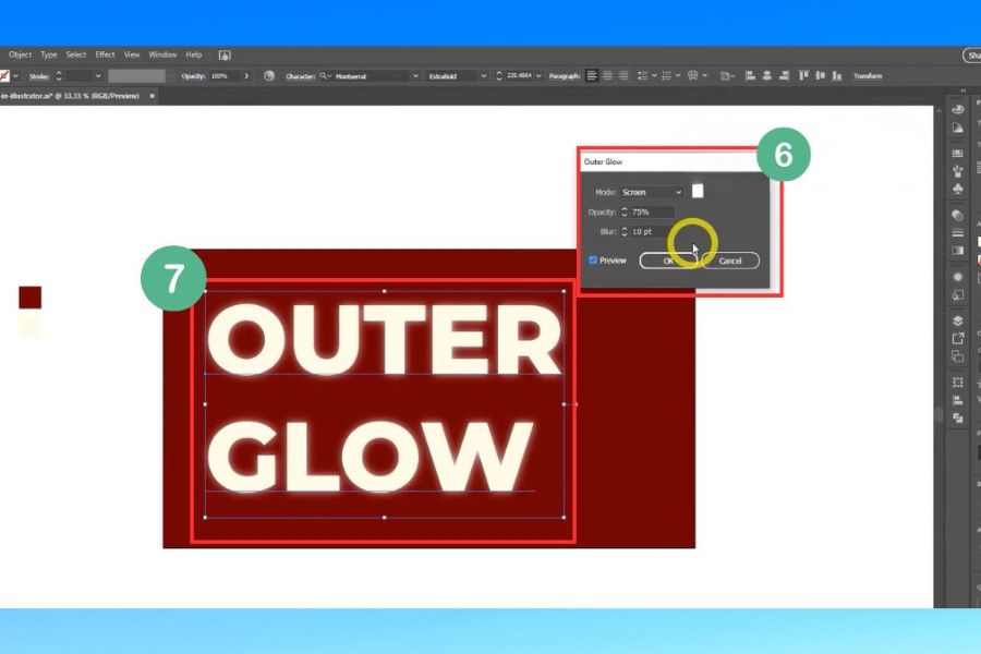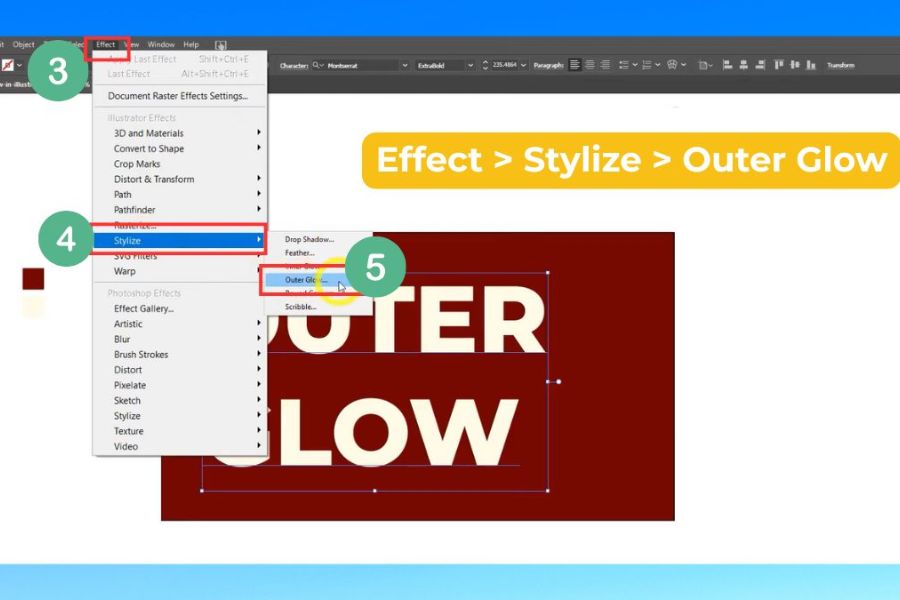 Sau khi nhập chữ, chọn toàn bộ văn bản và vào Effect > Stylize > Outer Glow. Lưu ý chọn Stylize trong nhóm Illustrator Effects, tránh chọn nhóm Photoshop Effects để hiệu ứng được áp dụng chính xác trong AI. Outer Glow sẽ giúp tạo lớp ánh sáng mềm mại xung quanh chữ, khiến chữ nổi bật mà vẫn giữ sự tinh tế và hài hòa với nền.