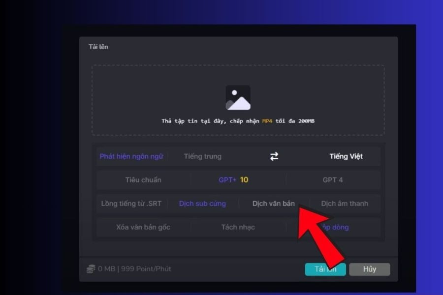 Tiếp theo, bạn cần chọn phương thức dịch để quyết định cách AI xử lý và xuất nội dung từ video. Hiện nay, công cụ AI thường hỗ trợ ba chế độ chính: Dịch sub cứng (chèn phụ đề trực tiếp vào video), Dịch văn bản (xuất file text để chỉnh sửa thủ công) và Dịch âm thanh (lồng tiếng mới cho video).