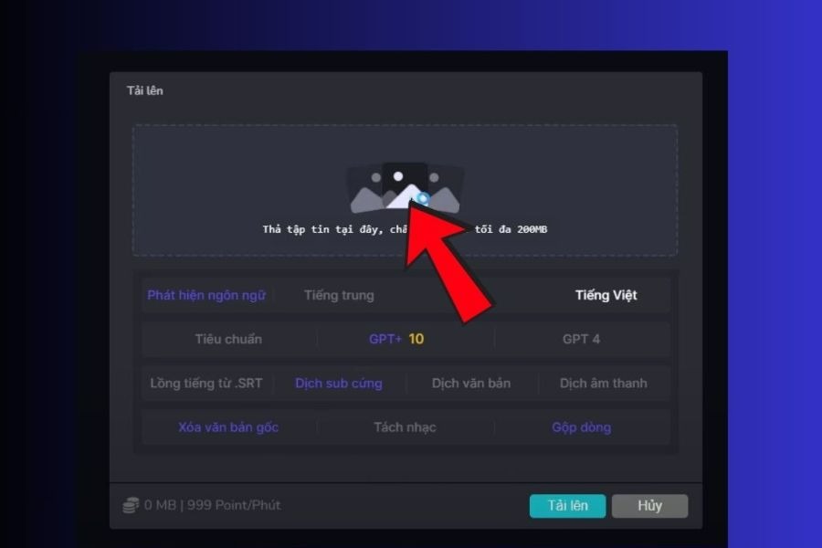 Khi đã hoàn tất các thiết lập cần thiết, bạn bắt đầu tải video cần dịch lên hệ thống. Tại giao diện chính, hãy nhấn vào khung Tải file, sau đó kéo thả video trực tiếp từ máy tính hoặc chọn file theo cách thủ công. Thao tác này khá đơn giản và phù hợp với cả người mới lần đầu sử dụng công cụ AI.