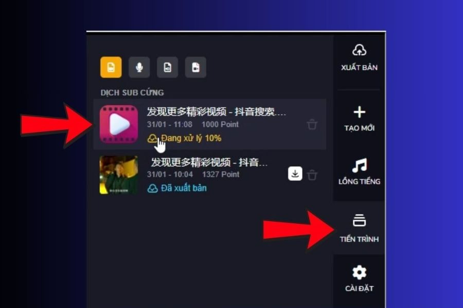 Sau khi video được tải lên và thiết lập xong các tùy chọn, hệ thống sẽ bắt đầu xử lý tự động. Trong mục Tiến trình, bạn có thể theo dõi trạng thái dịch của video theo thời gian thực, bao gồm các bước nhận diện, dịch nội dung và chèn phụ đề.