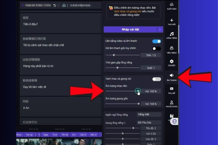 Sau khi hoàn tất phần phụ đề, bạn chuyển sang bước tinh chỉnh âm thanh để video nghe rõ ràng và dễ chịu hơn. Trong mục Âm thanh, hệ thống cho phép bạn điều chỉnh riêng biệt âm lượng của nhạc nền, giọng thoại gốc và giọng đọc lồng tiếng (nếu có), giúp bạn kiểm soát tốt trải nghiệm nghe của người xem.