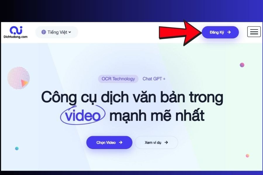 Trước tiên, bạn truy cập vào trang chủ của công cụ dịch AI DichTuDong.com. Tại giao diện chính, hãy chú ý khu vực góc trên bên phải màn hình và nhấn vào nút Đăng ký để bắt đầu tạo tài khoản mới. Quy trình đăng ký được thiết kế đơn giản, thân thiện, giúp người dùng lần đầu cũng dễ dàng thao tác.