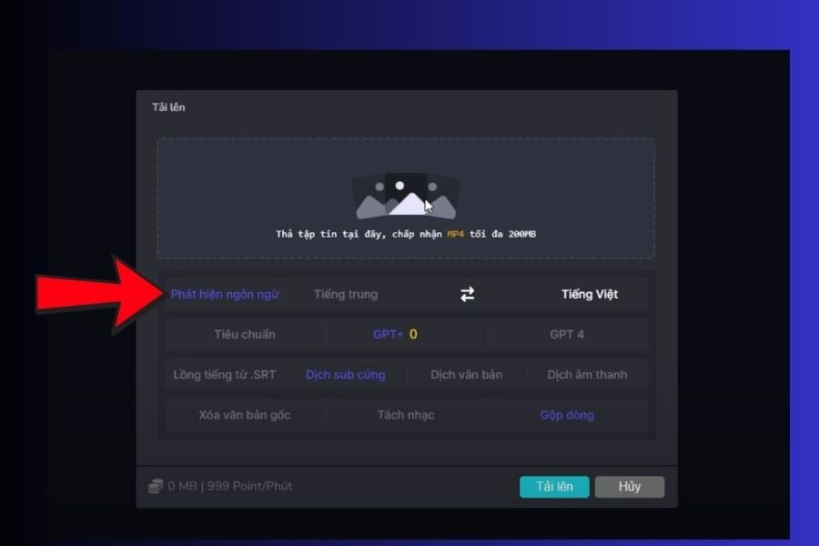 Để AI dịch chính xác và sát nghĩa hơn, bước tiếp theo là thiết lập ngôn ngữ gốc của video. Bạn có thể để hệ thống tự động phát hiện ngôn ngữ, đặc biệt hữu ích với các video phim có nhiều đoạn hội thoại hoặc nhiều giọng nói khác nhau. AI sẽ phân tích âm thanh và xác định ngôn ngữ phù hợp nhất.