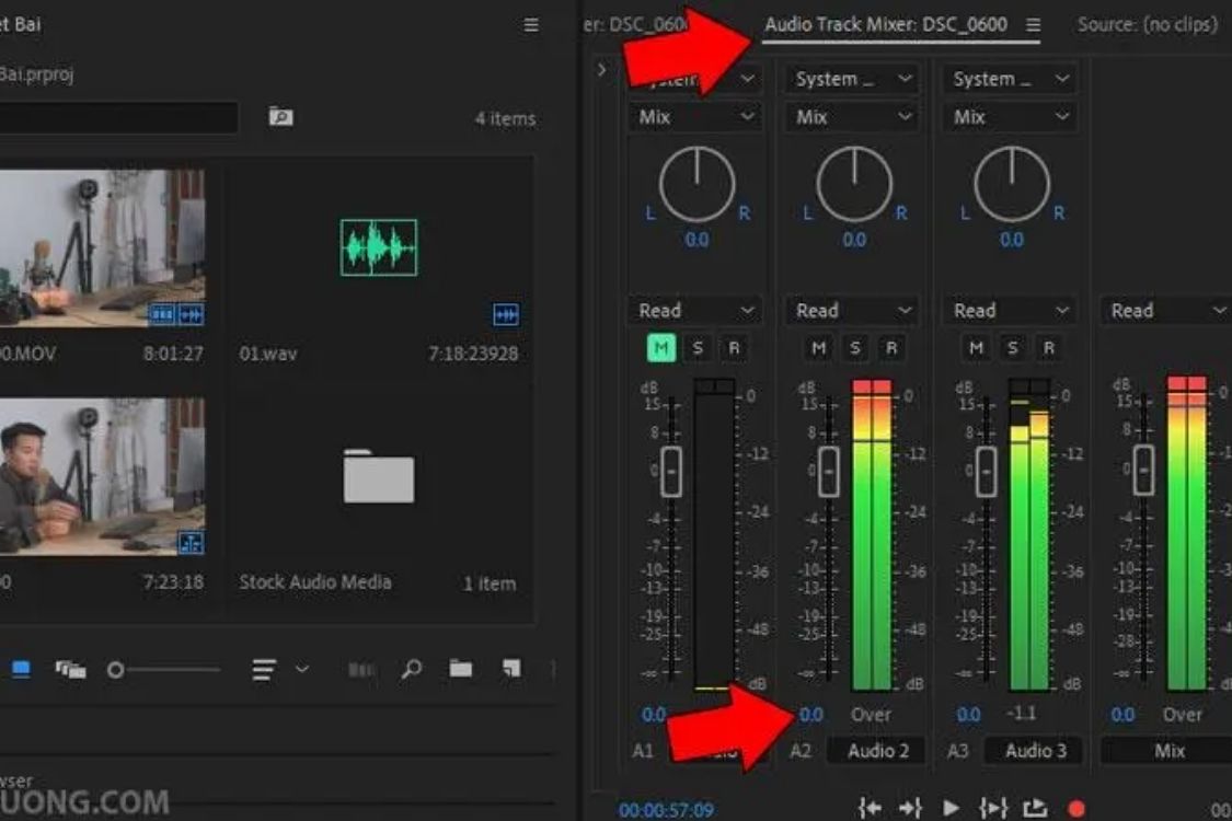 Mở bảng Audio Mixer: Chọn Window > Audio Mixer từ menu chính. Trong bảng Audio Mixer, mỗi track audio sẽ có một fader riêng, cho phép điều chỉnh âm lượng chi tiết theo từng track.