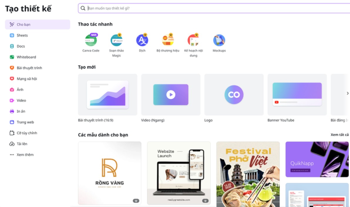 Sau khi đăng nhập, giao diện Canva hiện ra với bố cục rõ ràng, dễ hiểu. Thanh tìm kiếm nằm ở vị trí trung tâm cho phép bạn nhanh chóng tìm đến loại thiết kế mong muốn. Chỉ cần nhập từ khóa “tờ rơi”, Canva sẽ hiển thị một loạt kết quả liên quan, bao gồm các mẫu thiết kế theo nhiều phong cách và mục đích khác nhau.