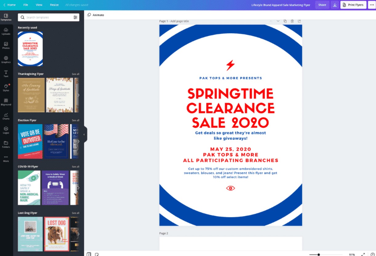 Thư viện mẫu của Canva là một trong những yếu tố khiến nền tảng này trở nên nổi bật. Các mẫu tờ rơi được phân loại theo chủ đề như kinh doanh, giáo dục, sự kiện, phi lợi nhuận hay marketing. Ngoài ra, người dùng còn có thể lọc theo phong cách thiết kế, bảng màu hoặc xu hướng thị giác.