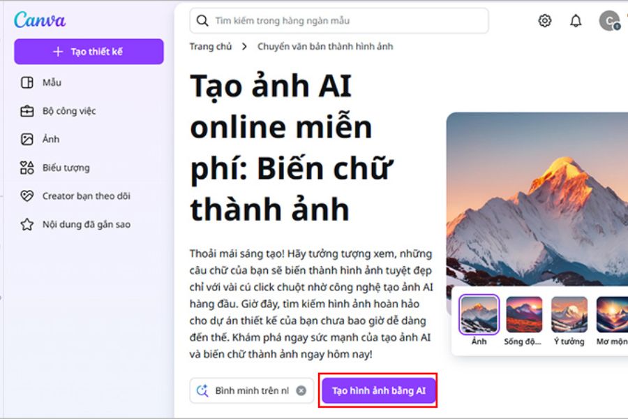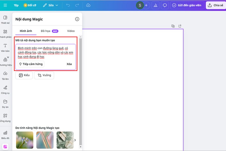 Sau khi vào công cụ, bạn sẽ thấy ô “Mô tả nội dung bạn muốn tạo”. Đây là phần quan trọng nhất quyết định chất lượng hình ảnh đầu ra. Bạn nên mô tả càng rõ ràng càng tốt về chủ đề, màu sắc, phong cách hoặc cảm xúc của bức ảnh để Canva AI dễ dàng “hiểu” đúng ý tưởng.