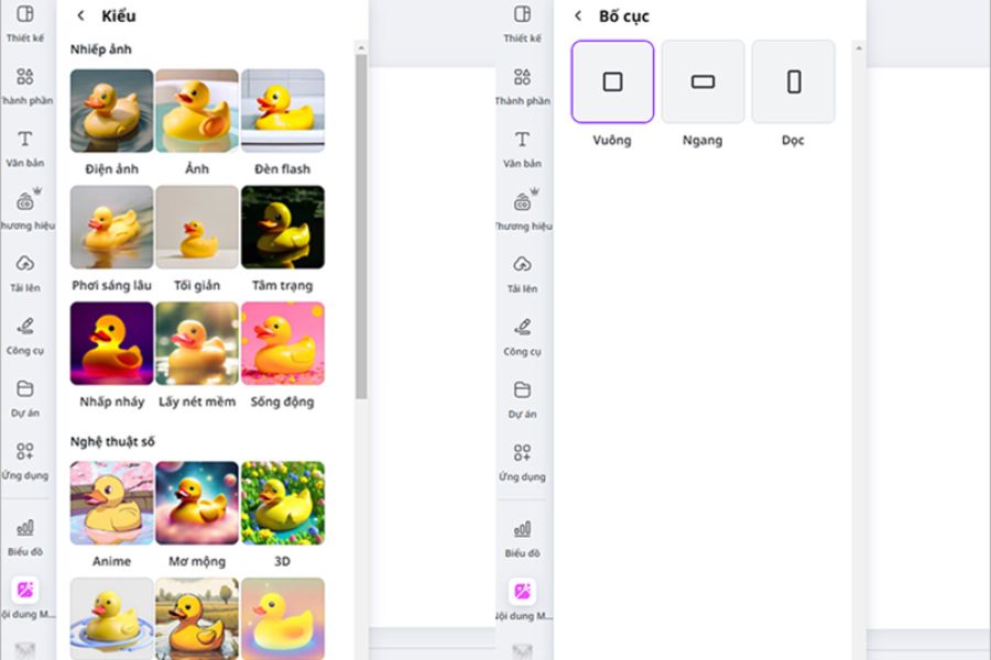 Ngoài ra, Canva AI còn cho phép bạn lựa chọn bố cục ảnh vuông, ngang hoặc dọc trong mục “Bố cục”. Việc chọn đúng kích thước ngay từ đầu sẽ giúp bạn tối ưu hình ảnh cho từng nền tảng, tránh phải cắt chỉnh lại sau này, tiết kiệm thêm thời gian thiết kế.