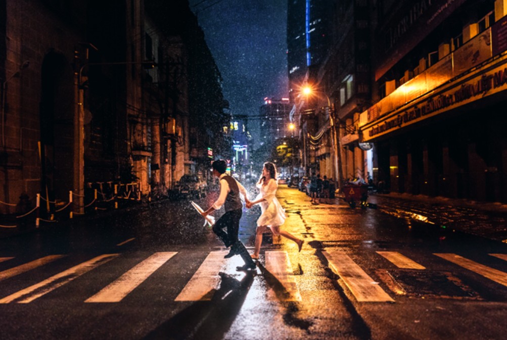 Nhiếp ảnh cưới không còn bị giới hạn bởi studio hay khung cảnh thiên nhiên quen thuộc. Nhiều cặp đôi chọn chụp trong các không gian đặc biệt như nhà kho bỏ hoang, rạp chiếu phim cổ hay giữa lòng thành phố về đêm. Mỗi địa điểm được khai thác như một sân khấu, nơi ánh sáng, trang phục và biểu cảm hòa quyện để tạo nên câu chuyện tình yêu có chiều sâu.