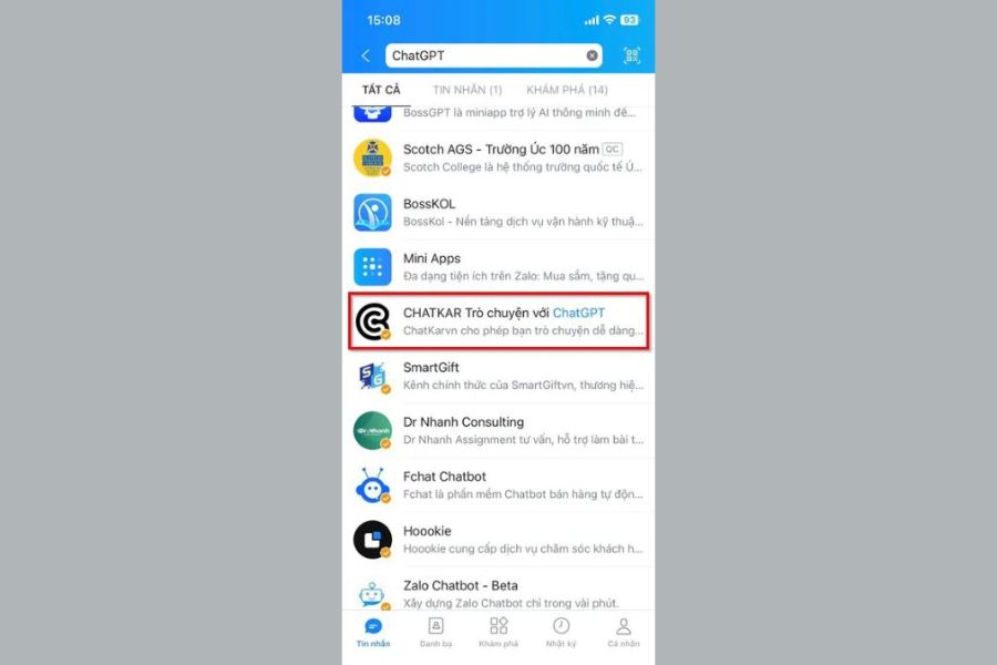 Đầu tiên, hãy mở ứng dụng Zalo trên điện thoại của bạn và dùng thanh tìm kiếm ở đầu giao diện. Gõ từ khóa "ChatGPT" hoặc "CHATKAR" để thu hẹp kết quả, sau đó tìm đến kênh có tên tương ứng đây thường là kênh được nhiều người sử dụng để trò chuyện với ChatGPT qua Zalo. Việc tìm đúng kênh sẽ giúp bạn kết nối nhanh chóng, không mất thời gian dò tìm giữa các kết quả không liên quan.