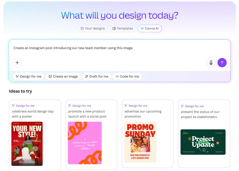 Bạn có thể nhập câu lệnh như: “Tạo cho tôi một logo cho thương hiệu cà phê phong cách vintage” hay “Thiết kế bài đăng Instagram chào mừng năm mới với tông màu đỏ – vàng hiện đại”. Chỉ sau vài giây, Canva AI sẽ hiểu yêu cầu, gợi ý các phong cách phù hợp và hiển thị ngay bản nháp để bạn tinh chỉnh.