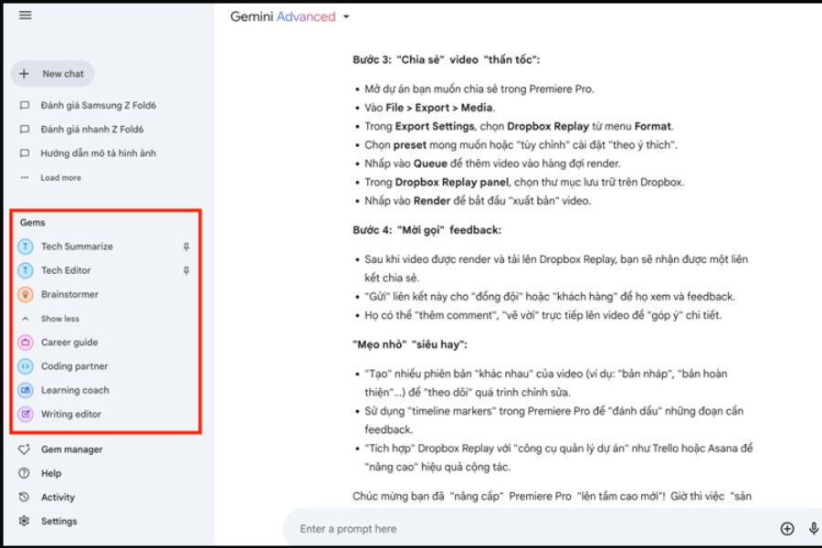 Khi bạn tìm thấy một Gem mẫu có chức năng gần giống với nhu cầu của mình, bạn hoàn toàn có thể sao chép lại và tùy chỉnh thêm. Việc này tương tự như lấy một bản template chất lượng rồi điều chỉnh theo phong cách cá nhân hoặc yêu cầu của doanh nghiệp. Nhờ cách tiếp cận linh hoạt và trực quan này, người dùng mới sẽ dễ dàng hơn trong việc làm quen với Gem, còn người dùng chuyên nghiệp lại tiết kiệm đáng kể thời gian thiết lập ban đầu mà vẫn tạo được một trợ lý phù hợp và hiệu quả.