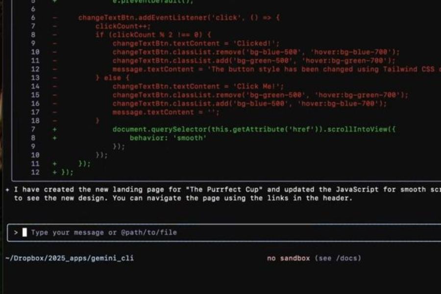 Gemini CLI cho phép lập trình viên viết mã mới hoặc xử lý lỗi trong dự án ngay trong Terminal chỉ bằng cách nhập prompt mô tả yêu cầu. Công cụ có thể giải thích từng đoạn mã phức tạp phân tích logic, nhận diện vấn đề và đưa ra cách sửa tối ưu giúp bạn tiết kiệm rất nhiều thời gian trong quá trình phát triển phần mềm. Với những dự án lớn có cấu trúc nhiều tầng Gemini CLI còn hỗ trợ xem xét cả file lẫn thư mục để đưa ra gợi ý sửa lỗi chính xác hơn.