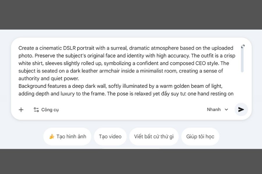 Tiếp theo, bạn chỉ cần copy – paste các câu lệnh tạo ảnh có sẵn vào khung mô tả. Các câu lệnh này đóng vai trò định hướng phong cách, trang phục, bối cảnh và thần thái cho bức ảnh. Chỉ với vài dòng mô tả đơn giản, Gemini sẽ hiểu bạn đang muốn tạo hình ảnh tổng tài lạnh lùng, quyền lực hay doanh nhân hiện đại. Điểm mạnh của Gemini là không cần câu lệnh quá dài hay phức tạp, nhưng vẫn cho ra hình ảnh có chiều sâu và cảm xúc rõ ràng.