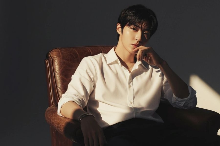 Background features a deep dark wall, softly illuminated by a warm golden beam of light, adding depth and luxury to the frame. The pose is relaxed yet đầy suy tư: one hand resting on the chin, eyes calm, expression lạnh lùng nhưng cuốn hút. Lighting follows the chiaroscuro style, strong contrast between warm highlights and deep shadows to emphasize facial structure and leadership aura. Camera angle is a medium front-facing shot, slightly tilted to enhance cinematic drama. Image quality in standard 4K, sharp details, professional studio feel.