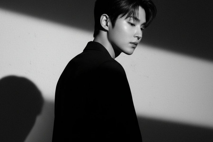 Lighting setup uses a single strong side light to cast sharp contrasts, with a clean horizontal beam of light cutting across the background wall. Most of the frame remains in shadow, highlighting the silhouette, posture, and masculine contours. The subject wears a dark jacket that blends into the shadows, creating a sleek, minimalist editorial look. Shot on a full-frame camera with an 85mm lens, f/1.8 aperture for shallow depth of field, ISO 200, shutter speed 1/125. Medium framing from waist to head. Post-processing includes high-contrast black-and-white tones, soft gradients, deep shadows, subtle film grain, and a fine-art editorial finish.