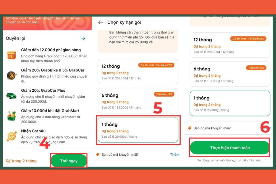 Trong giao diện Grab Unlimited, bạn chọn Dùng thử miễn phí (nếu là người mới) hoặc đăng ký gói với chi phí nhỏ khoảng 25.000đ/tháng. Đây là bước kích hoạt tư cách thành viên để đủ điều kiện nhận ưu đãi.