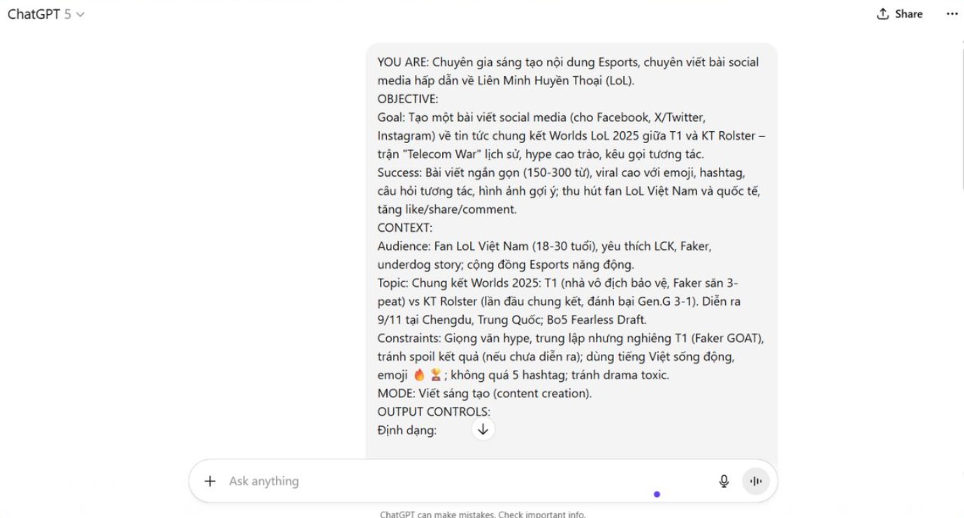 Việc tạo ra một cấu trúc prompt chuẩn, dễ sử dụng và có thể áp dụng linh hoạt trong mọi tình huống giúp bạn tránh được tình trạng đó. Đây không chỉ là mẹo sử dụng ChatGPT thông minh hơn, mà còn là kỹ năng quan trọng giúp rút ngắn thời gian làm việc, tăng chất lượng kết quả và đảm bảo tính nhất quán giữa các lần tương tác.