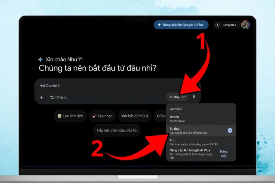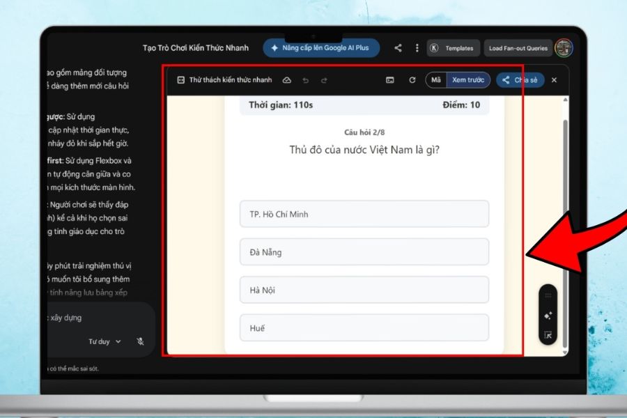Gemini cung cấp nhiều chế độ xử lý khác nhau để phù hợp với từng nhu cầu. Khi tạo game, bạn nên chọn chế độ Tư duy (Thinking) để AI có thể phân tích logic sâu hơn và xây dựng cấu trúc game rõ ràng hơn. Điều này đặc biệt quan trọng với các trò chơi có luật chơi hoặc hệ thống tính điểm.