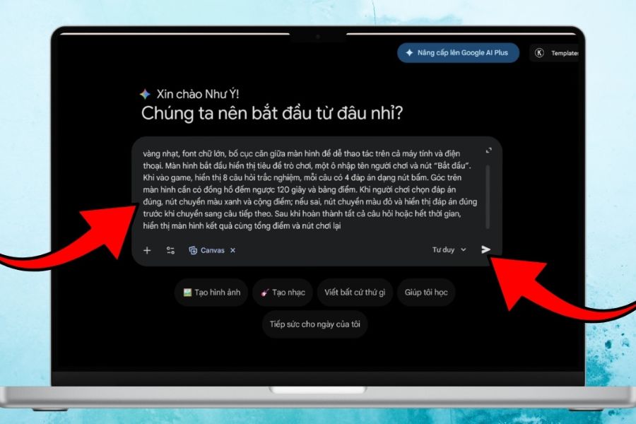 Một prompt hiệu quả nên bao gồm: thể loại game (trắc nghiệm, nhập vai, giải đố…), bối cảnh, nhân vật, mục tiêu người chơi, luật chơi và cách tính điểm. Ví dụ: “Tạo game trắc nghiệm về kiến thức bóng đá, có 10 câu hỏi, mỗi câu 4 đáp án, tính điểm và hiển thị kết quả cuối cùng”. Sau khi nhập xong, bạn chỉ cần nhấn Gửi để Gemini bắt đầu xử lý.