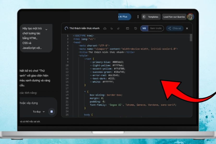 Sau khi nhận được yêu cầu, Gemini sẽ bắt đầu phân tích và tạo ra cấu trúc trò chơi ngay trong Canvas. Bạn sẽ thấy các đoạn mã HTML, CSS và JavaScript xuất hiện đây chính là nền tảng giúp game hoạt động trên trình duyệt.