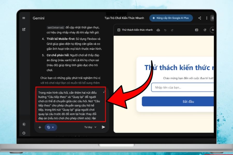 Điểm mạnh của Gemini là khả năng “hiểu ngữ cảnh”, nên bạn không cần viết lại từ đầu. Chỉ cần yêu cầu rõ ràng, AI sẽ cập nhật lại game dựa trên phiên bản trước đó, giúp bạn tiết kiệm rất nhiều thời gian và công sức.