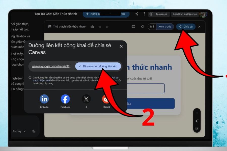 Sau khi hoàn thiện, bạn có thể chia sẻ trò chơi của mình với người khác một cách rất dễ dàng. Trong Canvas sẽ có nút Chia sẻ (Share), chỉ cần nhấn vào là hệ thống sẽ tạo một đường link công khai.