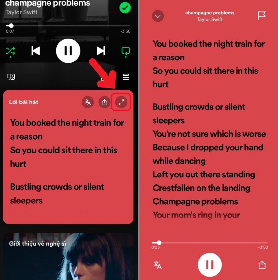 Bước 4: Ấn vào biểu tượng phóng to để hiện lyric full màn hình. Khi đó, toàn bộ lời bài hát sẽ hiển thị rõ ràng, chiếm toàn bộ màn hình điện thoại, tạo trải nghiệm như karaoke tại nhà. Bạn có thể di chuyển ngón tay lên xuống để xem trước các phần lời tiếp theo hoặc quay lại phần trước nếu muốn.