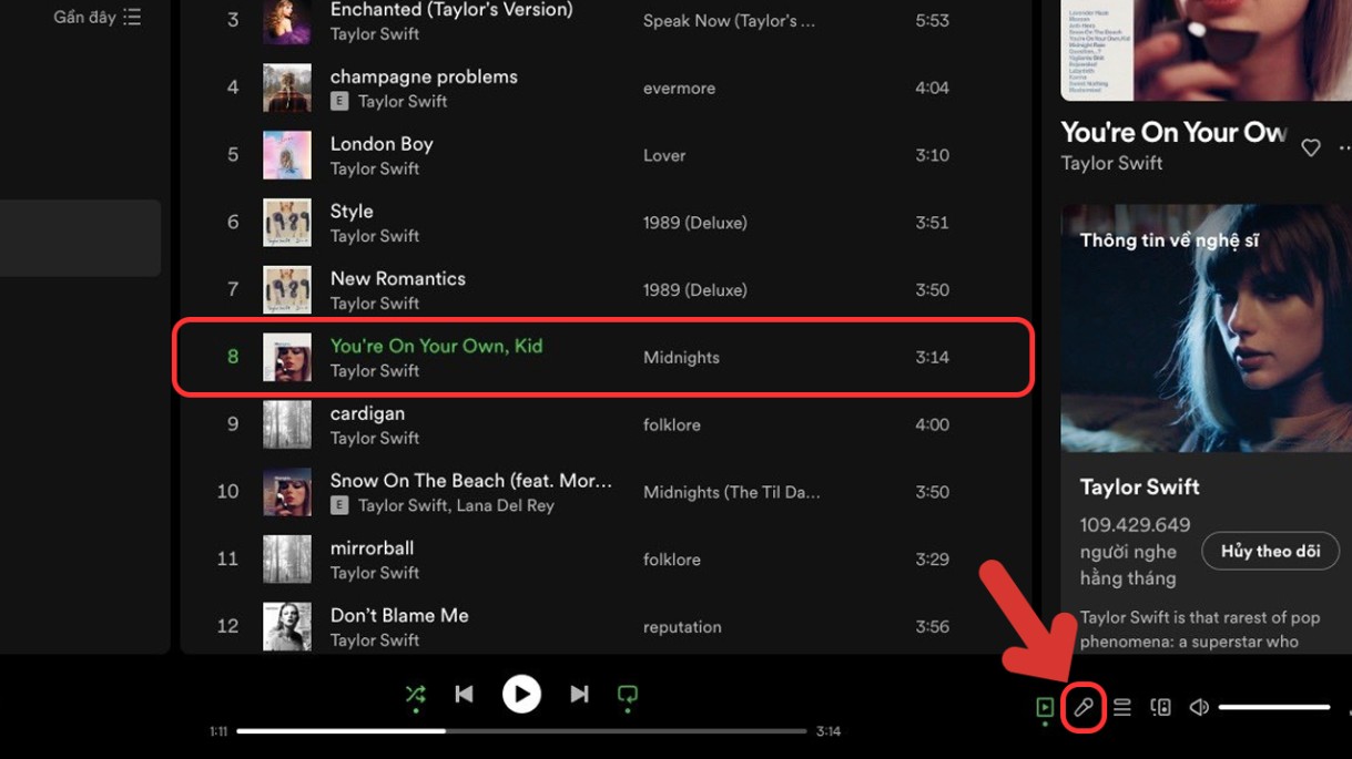 Bước 3: Tại thanh công cụ phát nhạc phía dưới màn hình, tìm và chọn biểu tượng hình Micro nằm bên dưới cùng để bật lyric. Khi nhấn vào biểu tượng này, Spotify sẽ hiển thị lời bài hát đồng bộ với nhạc.