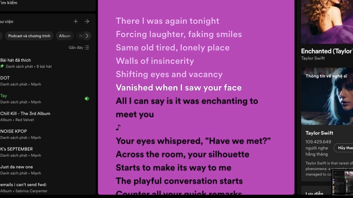 Bước 4: Sau khi bật, lyric sẽ xuất hiện trên màn hình. Bạn có thể tùy chỉnh kích thước cửa sổ hoặc kéo ra để theo dõi dễ dàng khi làm việc khác trên máy tính. Tính năng này cực kỳ hữu ích khi bạn muốn học thuộc bài hát, luyện nghe tiếng Anh qua nhạc hoặc đơn giản là thưởng thức âm nhạc một cách trọn vẹn.