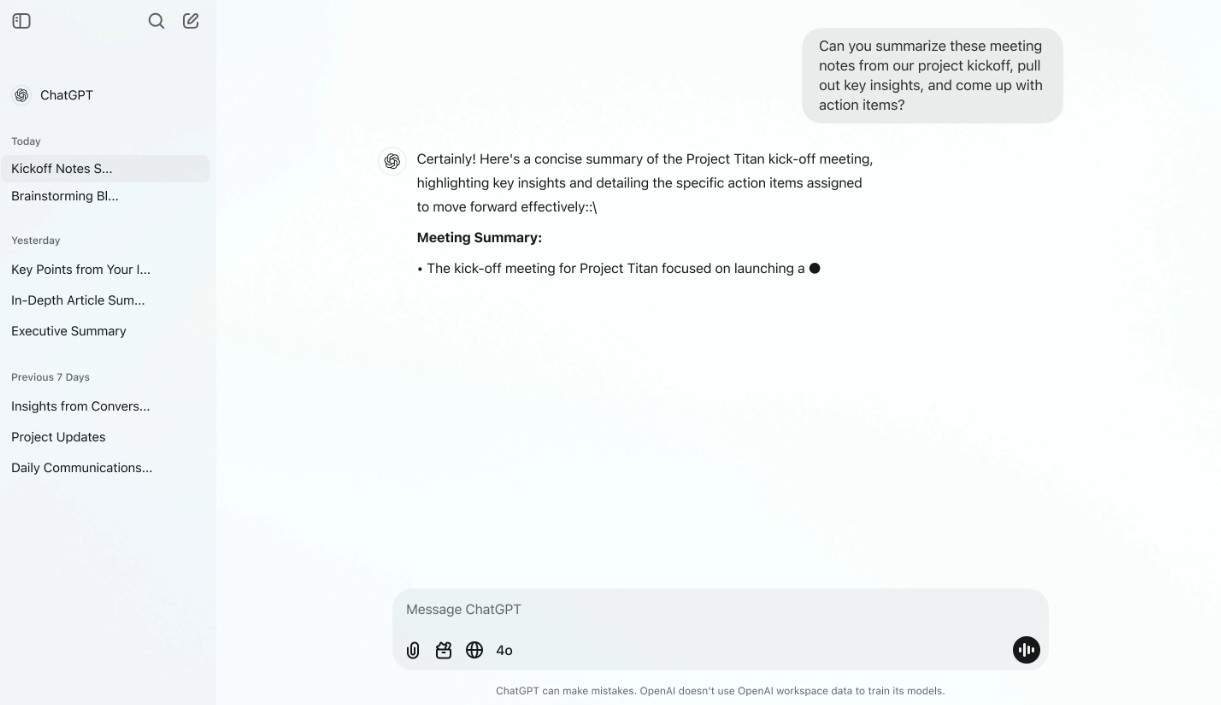 Đối với các doanh nghiệp sử dụng ChatGPT làm công cụ hỗ trợ khách hàng hoặc tổng hợp kiến thức, việc lưu trữ hội thoại giúp nhóm làm việc duy trì ngân hàng dữ liệu phản hồi. Các phiếu hỗ trợ cũ có thể được lưu trữ, phân loại và tra cứu khi cần xử lý tình huống tương tự.