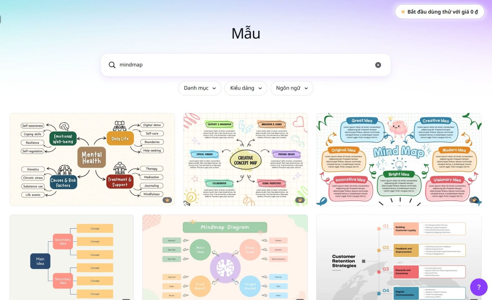 Canva cung cấp rất nhiều mẫu sơ đồ tư duy được thiết kế sẵn với nhiều phong cách khác nhau. Bạn có thể lựa chọn mẫu phù hợp với mục tiêu sử dụng, từ học tập đến công việc hay sáng tạo nội dung. Các mẫu này đều có thể chỉnh sửa dễ dàng, giúp bạn tiết kiệm thời gian và tập trung vào việc phát triển ý tưởng.