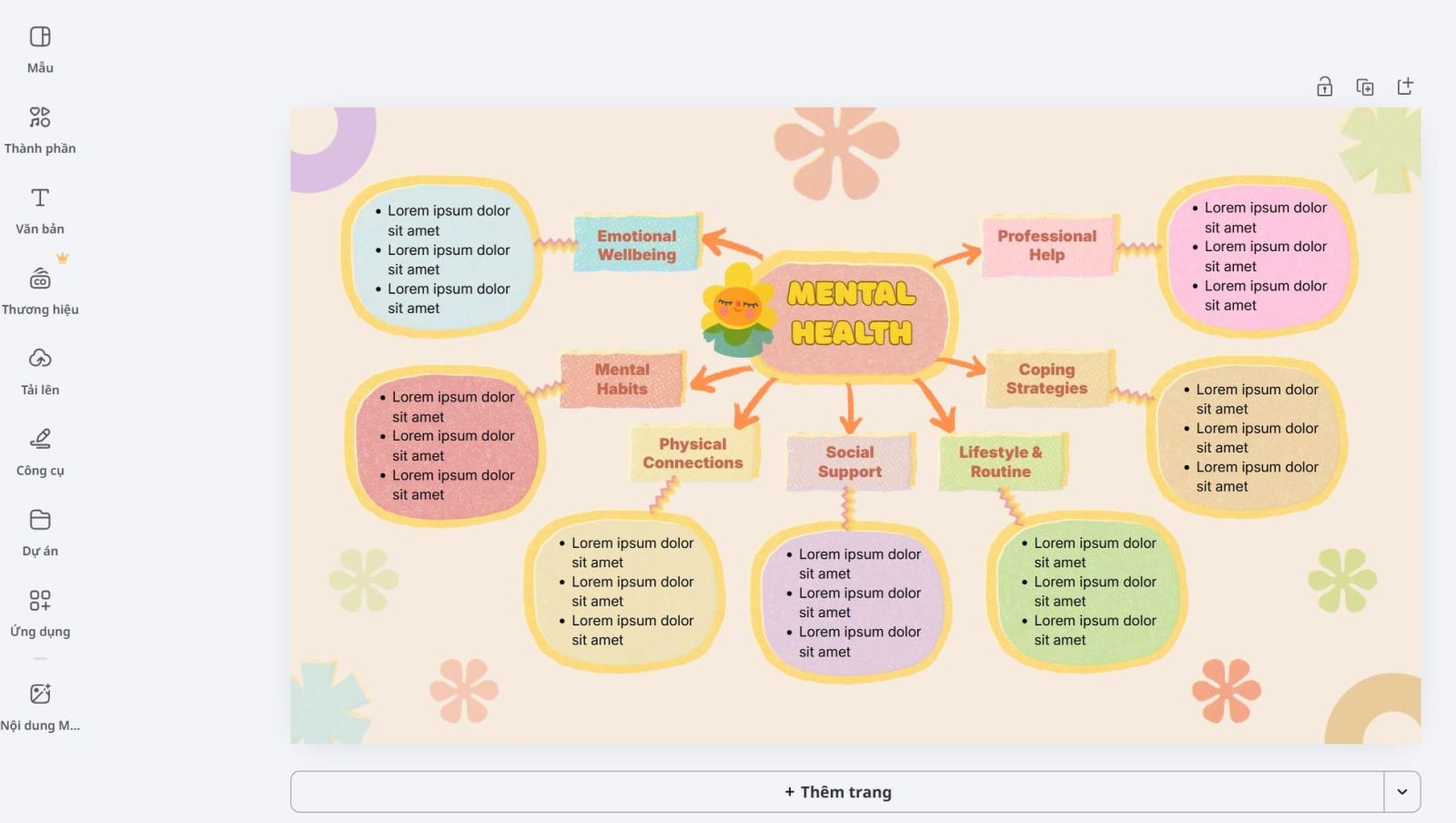 Sự kết hợp giữa hình ảnh, màu sắc và bố cục trong sơ đồ tư duy giúp kích thích não bộ hoạt động mạnh mẽ hơn so với việc chỉ đọc chữ. Canva cung cấp một thư viện nội dung phong phú cho phép bạn thêm hình ảnh, biểu tượng và đồ họa vào sơ đồ, từ đó làm cho nội dung trở nên sinh động và dễ nhớ hơn. Ngoài ra, các tính năng như chuyển văn bản thành hình ảnh còn giúp bạn biến những ý tưởng trừu tượng thành hình ảnh cụ thể, mở ra nhiều hướng suy nghĩ sáng tạo.