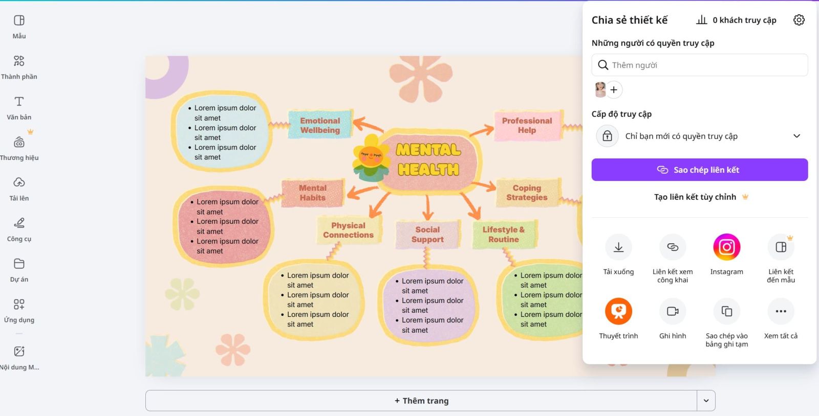 Sau khi hoàn tất, bạn có thể chia sẻ sơ đồ với người khác thông qua liên kết hoặc tải xuống dưới nhiều định dạng khác nhau. Canva cũng hỗ trợ trình chiếu trực tiếp, giúp bạn dễ dàng sử dụng sơ đồ tư duy trong các buổi thuyết trình hoặc họp nhóm. Việc chia sẻ không chỉ giúp lan tỏa ý tưởng mà còn mở ra cơ hội nhận phản hồi và cải thiện nội dung.