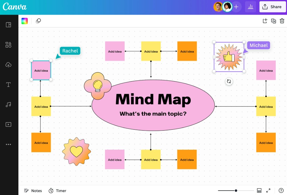 Bên cạnh đó, Canva cung cấp kho mẫu chuyên nghiệp, đa dạng phong cách giúp bạn tiết kiệm thời gian thiết kế và tập trung vào nội dung. Các công cụ như sticky notes, hình dạng, mũi tên và biểu tượng hỗ trợ việc kết nối ý tưởng rõ ràng, trong khi sticker và bộ đếm ngược giúp tăng tính tương tác trong quá trình thảo luận. Khả năng cộng tác theo thời gian thực cho phép nhiều người cùng chỉnh sửa trên một bảng, theo dõi thay đổi và trao đổi trực tiếp, giúp làm việc nhóm hiệu quả hơn dù ở bất kỳ đâu. Ngoài ra, Canva còn hỗ trợ tích hợp sơ đồ vào tài liệu, bài thuyết trình hoặc website, giúp bạn dễ dàng trình bày và chia sẻ ý tưởng một cách chuyên nghiệp.