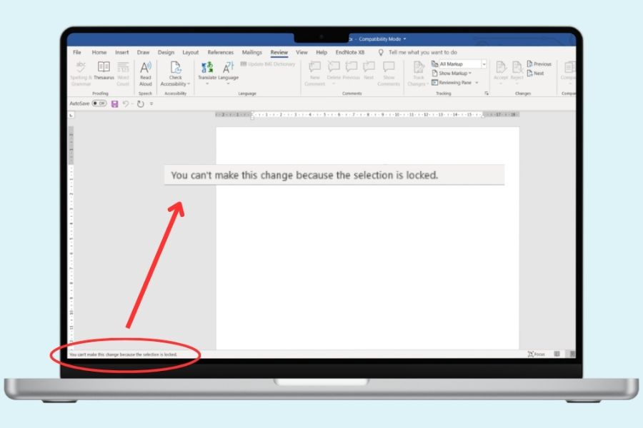 Lỗi “The Selection Is Locked” trên Microsoft Word là tình trạng tài liệu bị hạn chế quyền chỉnh sửa, khiến bạn không thể nhập, xóa hoặc thay đổi nội dung như bình thường. Khi lỗi này xuất hiện, nhiều công cụ trên thanh Ribbon sẽ bị vô hiệu hóa, đồng thời các thao tác như gõ phím hay định dạng văn bản cũng không hoạt động, gây gián đoạn công việc và khiến người dùng khá bối rối.