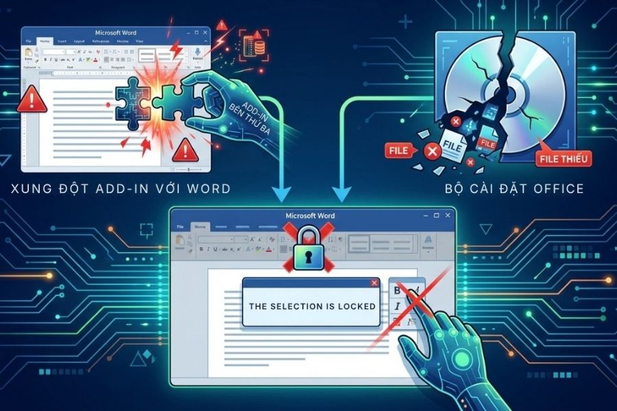 Không phải lúc nào lỗi “The Selection Is Locked” cũng xuất phát từ cài đặt tài liệu, mà đôi khi đến từ xung đột phần mềm. Các Add-in bên thứ ba khi cài vào Microsoft Word có thể can thiệp vào chức năng chỉnh sửa, gây ra tình trạng bị khóa ngoài ý muốn. Bên cạnh đó, nếu bộ cài Office bị lỗi, thiếu file hoặc gặp trục trặc trong quá trình cập nhật, một số tính năng quan trọng cũng có thể ngừng hoạt động. Trong trường hợp này, việc kiểm tra Add-in hoặc sửa lỗi cài đặt Office sẽ giúp bạn khắc phục triệt để vấn đề.