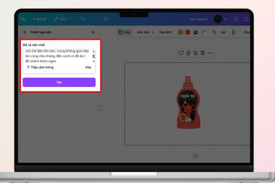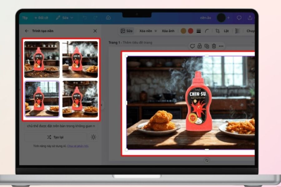 Khi đã chọn được nền ưng ý, bạn chỉ cần nhấn áp dụng để hoàn tất. Nếu cảm thấy chưa thật sự hài lòng, bạn hoàn toàn có thể chỉnh sửa lại mô tả hoặc yêu cầu AI tạo lại nền mới. Nhờ khả năng thử nhiều phương án nhanh chóng, bạn sẽ dễ dàng tìm được phiên bản tối ưu mà không mất quá nhiều thời gian như cách chỉnh sửa truyền thống.