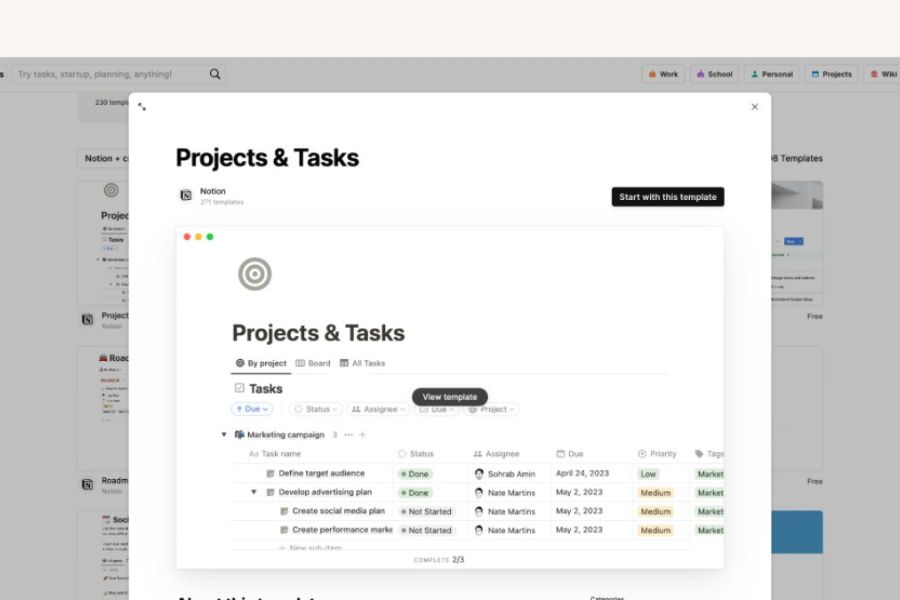 Bước 2: Tiếp theo, Notion cung cấp sẵn nhiều mẫu trang để theo dõi và quản lý dự án. Bạn có thể nhấp vào “Templates” và tìm đến mục “Project Management” để chọn một mẫu phù hợp. Nếu muốn sáng tạo hơn, bạn hoàn toàn có thể tự thiết kế từ đầu bằng cách thêm các khối cơ bản như bảng, danh sách hoặc lịch. Điều này giúp bạn linh hoạt điều chỉnh cấu trúc sao cho phù hợp với phong cách làm việc của mình.