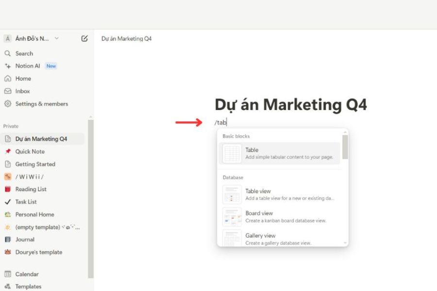 Bước 2: Sau khi tạo trang, bạn có thể linh hoạt thêm các khối văn bản, danh sách hoặc bảng bằng cách gõ “/”. Đây là điểm mạnh khiến Notion trở thành công cụ sáng tạo tuyệt vời ạn có thể tạo cấu trúc riêng theo phong cách cá nhân. Chẳng hạn, sử dụng bảng để liệt kê các ý tưởng bài viết, thêm cột “Trạng thái” hoặc “Thời gian đăng bài”, hoặc tạo danh sách ý tưởng dưới dạng checklist để dễ theo dõi tiến độ.