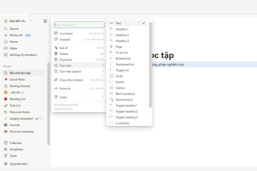 Bước 2: Trong trang vừa tạo, bạn có thể bắt đầu nhập nội dung trực tiếp hoặc gõ “/text” để thêm khối văn bản. Hãy tận dụng các công cụ định dạng như in đậm, nghiêng, gạch chân hay tô màu để làm nổi bật những ý quan trọng. Những chi tiết nhỏ này sẽ giúp phần ghi chú của bạn trở nên sinh động và dễ đọc hơn nhiều.