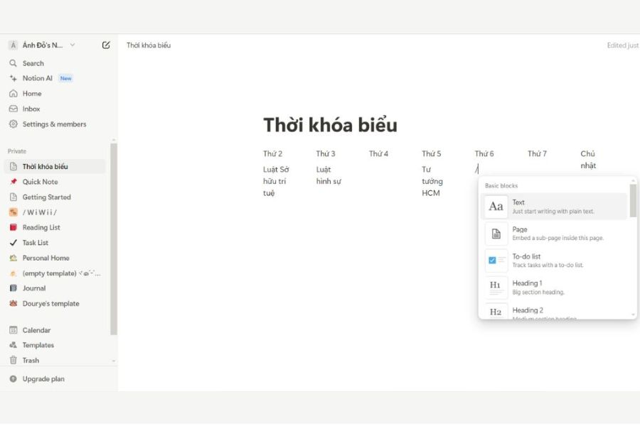 Bước 1: Trong giao diện chính của Notion, bạn tạo một trang mới và đặt tiêu đề “Thời Khóa Biểu” hoặc “Lịch Làm Việc Tuần”. Trang này sẽ là nơi bạn theo dõi toàn bộ lịch trình cá nhân một cách trực quan và khoa học.