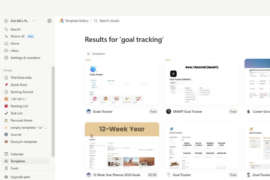 Bước 2: Trong phần “Templates”, hãy tìm từ khóa “Goal Tracking” hoặc “Objectives”. Notion có nhiều mẫu được thiết kế sẵn với hệ thống bảng theo dõi chi tiết, nơi bạn có thể chia nhỏ mục tiêu thành các bước thực hiện cụ thể. Ví dụ, mục tiêu “Học tiếng Anh giao tiếp” có thể chia thành “Đăng ký khóa học”, “Học 30 phút mỗi ngày”, “Luyện nói mỗi cuối tuần”.