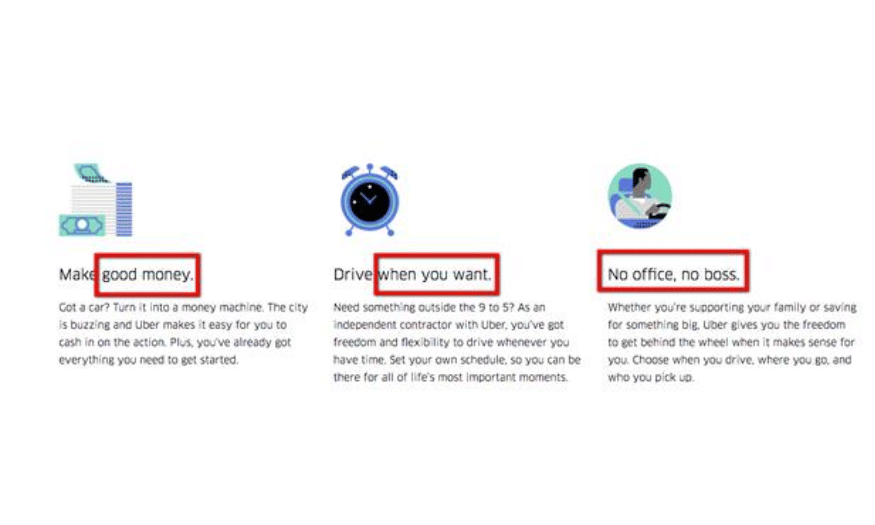 Landing page của Uber là một ví dụ điển hình cho việc nhấn mạnh lợi ích. Khi nhắm đến những tài xế tiềm năng, họ không chỉ nói về công việc lái xe mà còn nhấn mạnh rằng tài xế sẽ có sự tự chủ trong công việc của mình, không bị bó hẹp bởi những quy tắc cứng nhắc của các doanh nghiệp taxi. Họ cũng cho thấy rằng tài xế sẽ nhận được thu nhập tốt hơn, vì không phải chiết khấu quá nhiều cho chủ doanh nghiệp. Điều này giúp Uber tạo ra một hình ảnh hấp dẫn và thu hút, khuyến khích tài xế tiềm năng tham gia.