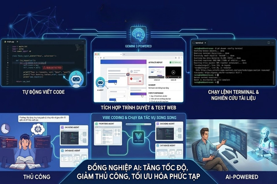 Google Antigravity AI là nền tảng phát triển phần mềm dựa trên AI theo hướng agent-first - nơi AI không chỉ gợi ý code đơn thuần mà thực sự lập kế hoạch, viết code, debug, chạy test và hỗ trợ quy trình phát triển như một “đồng đội kỹ thuật số”.